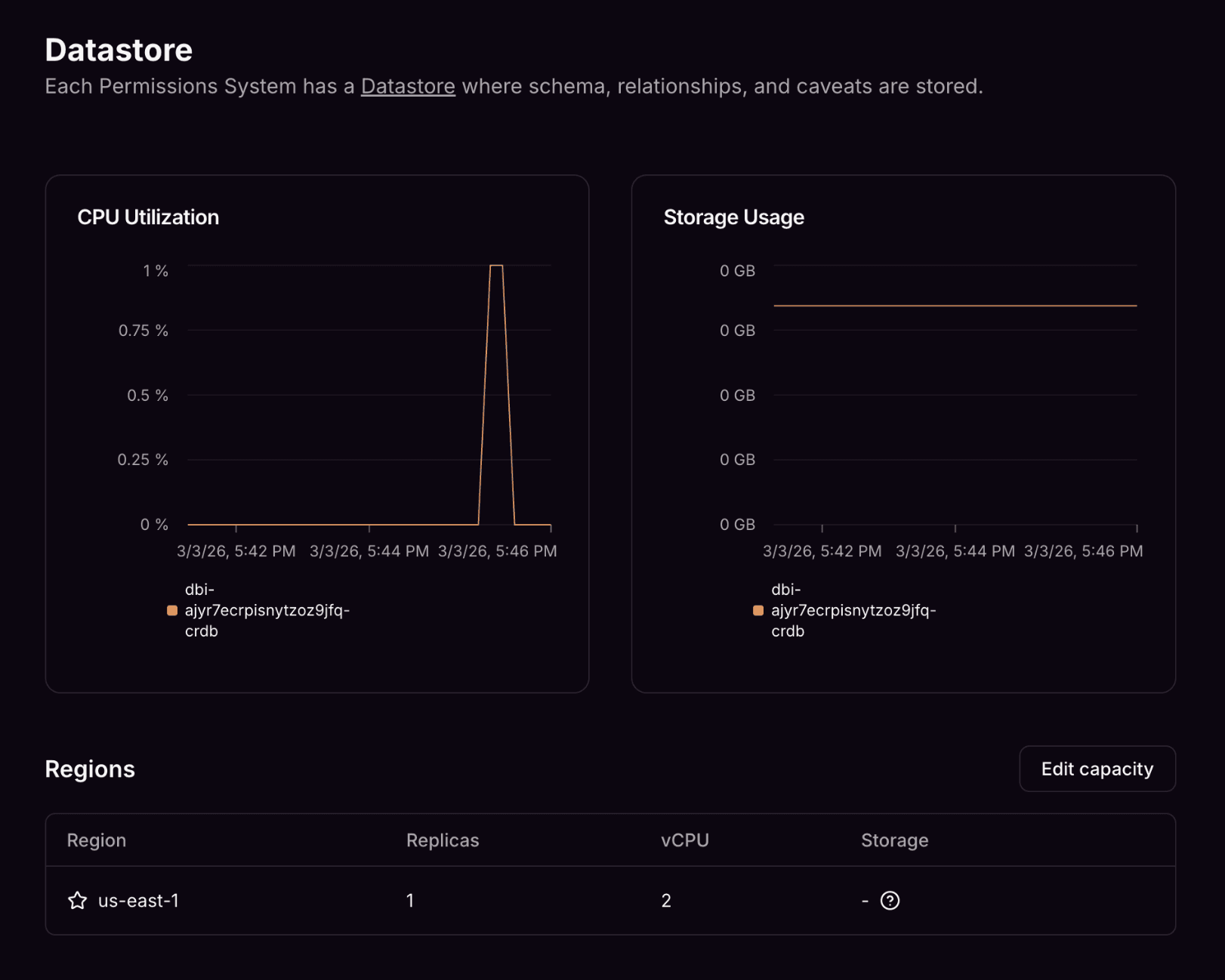 As of today, we've unlocked the ability for customers of the AuthZed Cloud platform to scale operations themselves. By visiting the DataStore Overview page, users of AuthZed Cloud are able to inspect the underlying configuration, performance, and health of the datastore powering the storage layer of their SpiceDB permission systems. AuthZed is stepping out of the way, not only to provide more visibility but to also give customers operational independence. This capability is rolling out on a per-customer basis to AuthZed Dedicated soon.