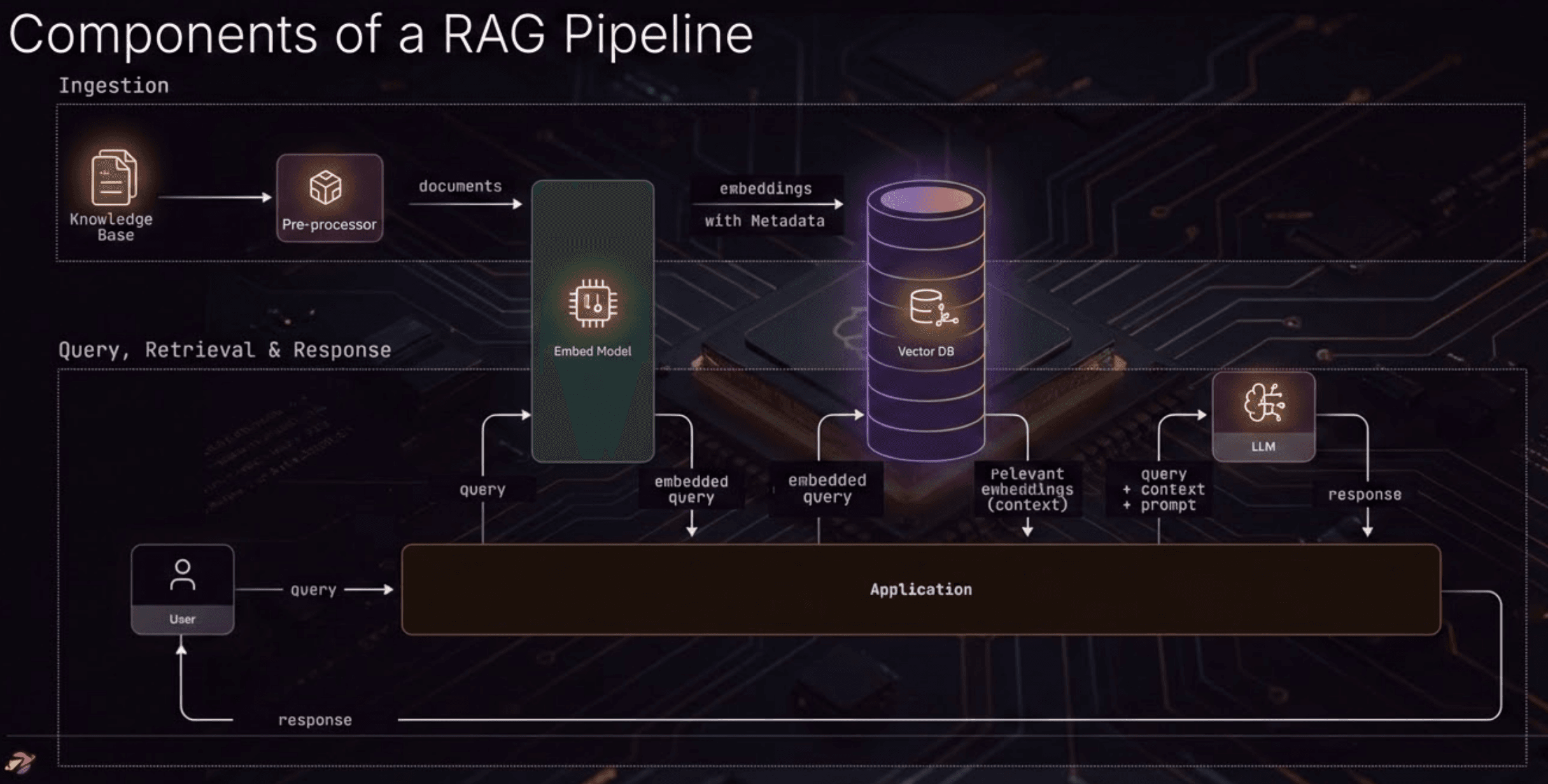 User asks a question → you embed it → you fetch the closest vectors → you hand those documents to an LLM → the LLM answers.