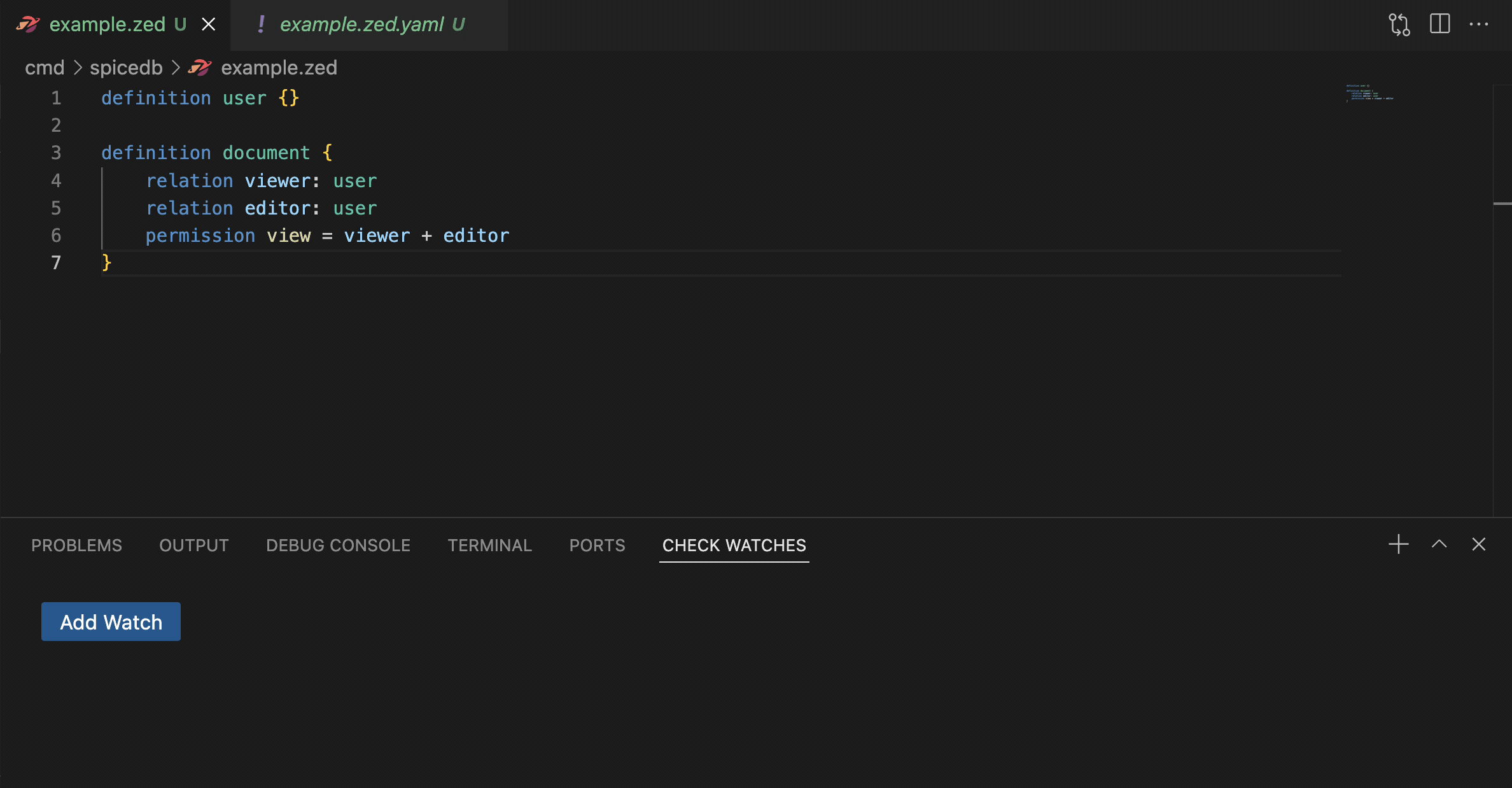 To use the check watch panel, a file containing relationships yaml named {name}.zed.yaml is placed in the same directory as the {name}.zed schema file being checked. The relationships+schema are then evaluated by SpiceDB and used to display the results of the check permissions calls executed against the schema+relationships.