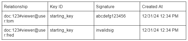 --datastore-relationship-integrity-expired-keysargument is a set of JSON blobs, each containing the key information for an expired key.When SpiceDB reads the relationships from the datastore, it will verify that an expired key was only used to sign a relationship before the expiration date+time. Any use of the expired key for a relationship after that point-in-time will fail.